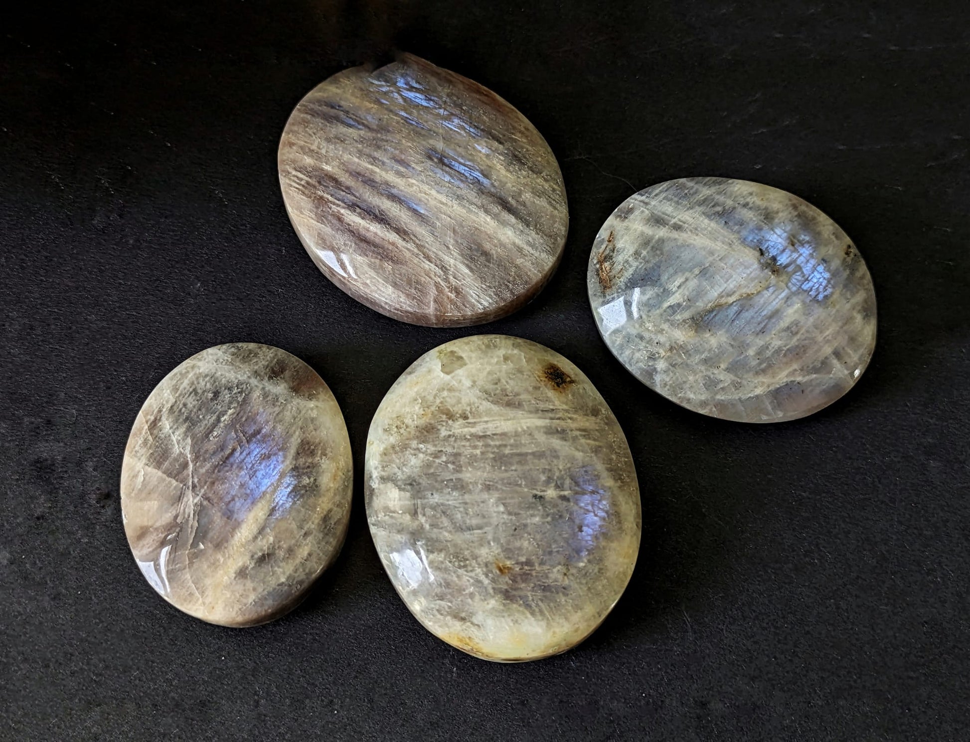 Moonstone is often associated with the feminine and is believed to empower and nurture feminine qualities, such as intuition, receptivity, and emotional intelligence. In crystal healing, rainbow moonstone is often use to restore emotional balance and calm overactive mind.